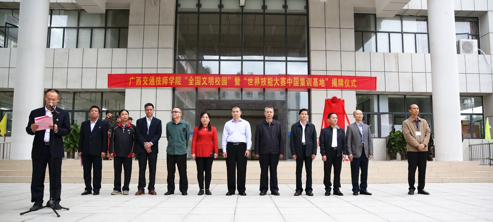 10月15日下午,广西交通技师学院在该院综合楼举行“全国文明校园”暨“世界技能大赛中国集训基地”揭牌仪式。自治区交通运输厅厅长陈鸿起、自治区直属机关工作委员会副书记苏德明、自治区人力资源和社会保障厅副厅长潘志金、自治区直属机关文明办主任颜东伟、自治区人力资源和社会保障厅职业能力建设处处长杨春华、自治区交通运输厅科教处副处长张斯悦、自治区道路运输管理局党委书记罗华、广西交通技师学院领导班子等领导出席仪式。广西交通技师学院院长钟修仁主持揭牌仪式。近年来,该院始终以“德育为先修品质、依托行业办专业、校企交融谋发展、课程体系重能力、服务行业显成效、高技高质创品牌”为办学特色,注重内涵发展,不断完善教师队伍建设长效机制,创建独特校园文化,形成学生乐于学、教师乐于教的良好校园氛围。在师生技能竞赛方面,始终坚持“以赛促改、以赛促练、以赛促学、以赛强技”的教学模式,积极投身技能界“奥林匹克”—世界技能大赛中,在师资队伍、设备设施、集训场地、文化建设、运行机制等方面都积累了丰富的经验。2017年,该院被中央精神文明建设指导委员会授予首届“全国文明校园”称号,是全国唯一入选此项荣誉的的技工院校;2018年8月,被国家人力资源和社会保障部确定为“第45届世界技能大赛汽车喷漆项目中国集训基地”,实现了广西世界技能大赛中国集训基地零的突破。