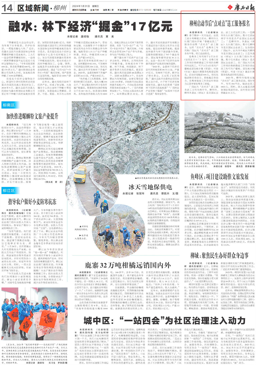 2023年,柳州市精准实施“点对点”送工服务活动,组织专车、专列184车次,输送农民工6833人。同时,深入实施重点群体创业推进行动,农村劳动力转移就业61万人。
