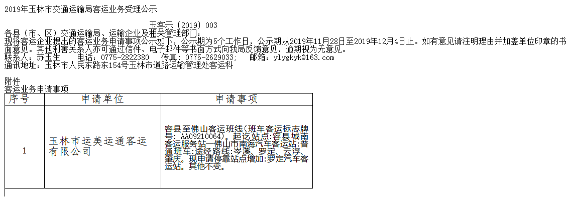 2019年玉林市交通运输局客运业务受理公示(玉客示〔2019〕003)