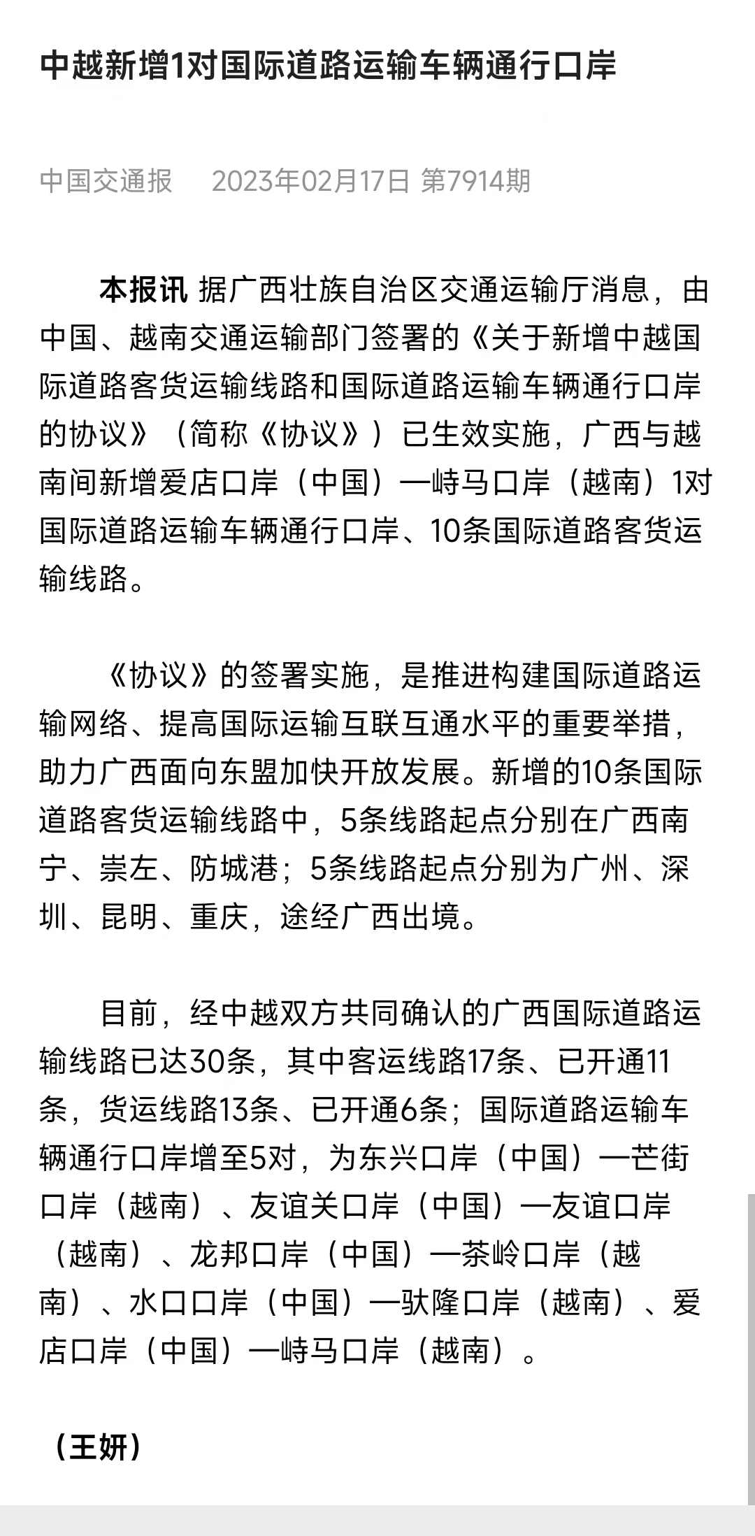 据广西壮族自治区交通运输厅消息,由中国、越南交通运输部门签署的《关于新增中越国际道路客货运输线路和国际道路运输车辆通行口岸的协议》(简称《协议》)已生效实施,广西与越南间新增爱店口岸(中国)—峙马口岸(越南)1对国际道路运输车辆通行口岸、10条国际道路客货运输线路。