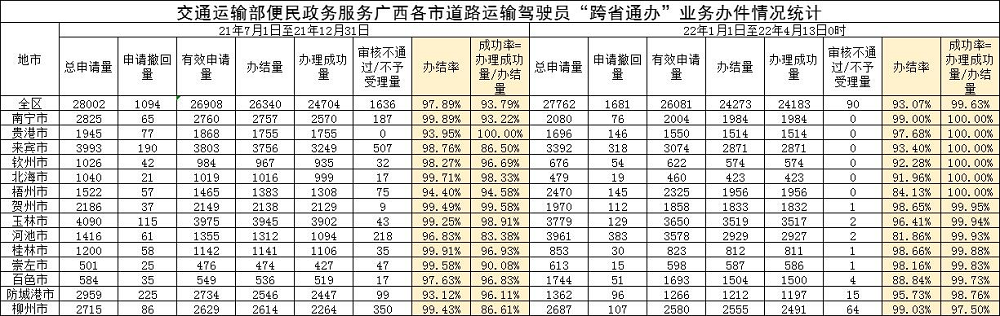2021年7月1日至2022年4月13日零时交通运输部便民服务广西各市道路运输驾驶员“跨省...