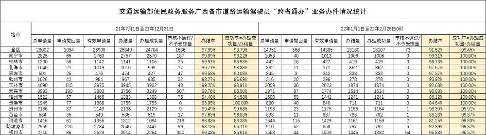 2021年7月1日至2022年2月25日零时交通运输部便民服务广西各市道路运输驾驶员“跨省...