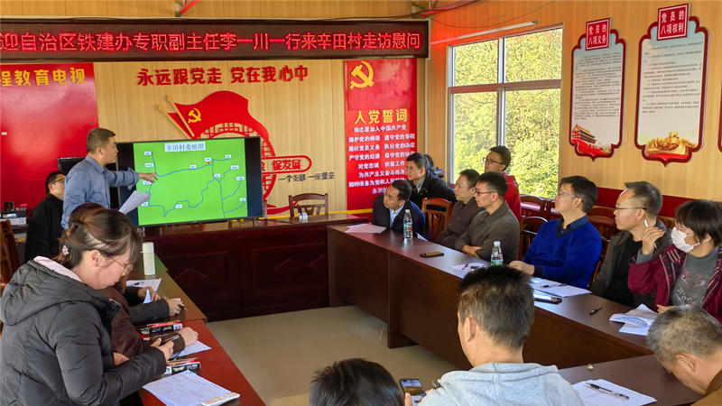 (自治区铁建办专职副主任李一川(右三)听取辛田村驻村第一书记王尧飞介绍结对帮扶人员情况。)