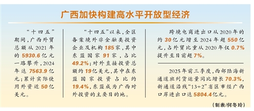 “十四五”期间,广西外贸总额从2021年的5930.6亿元一路攀升,2024年达7563.9亿元;累计实际使用外资近50亿美元。