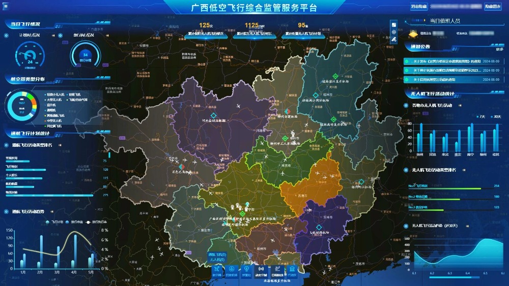 为切实筑牢低空安全防线,依托初步构建的“1+N”广西低空飞行服务管理架构(即1个自治区级核心平台+N个地市级子平台),精准发力开展低空监管服务能力建设,目前已取得一系列阶段性成效,为低空经济安全有序发展提供了有力保障。