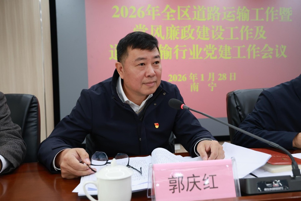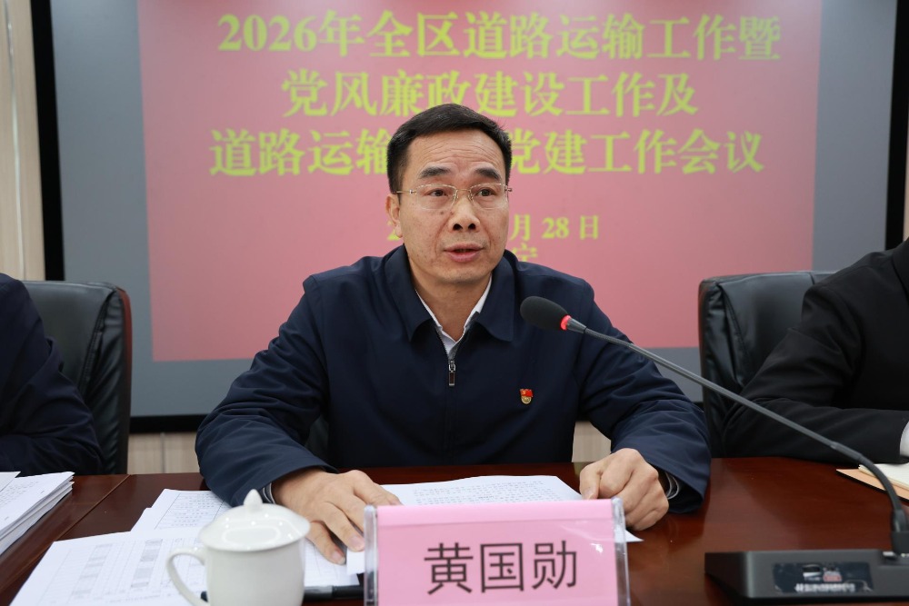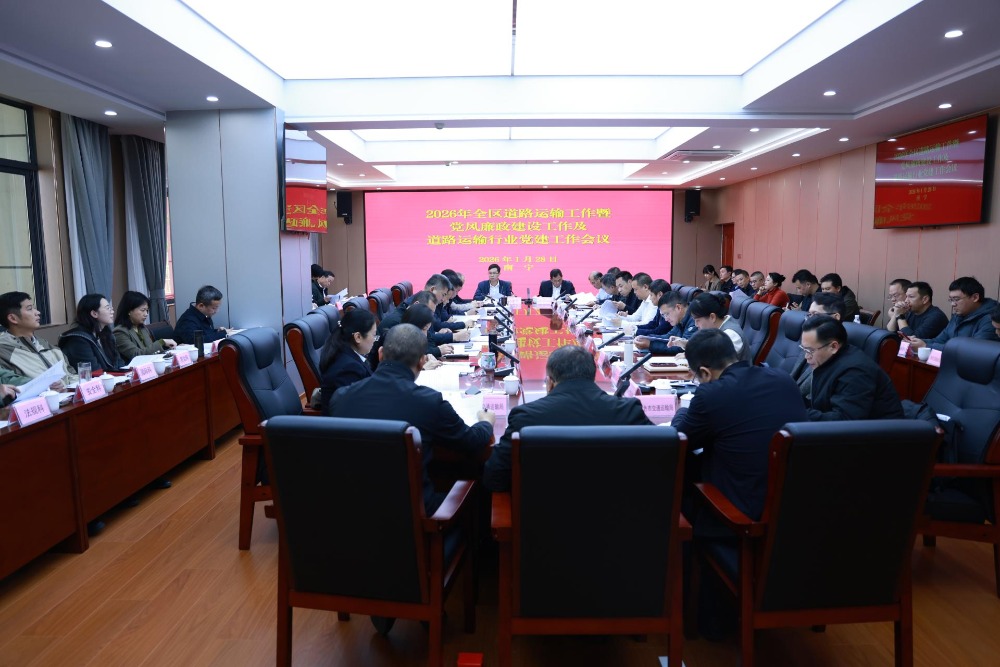 1月28日,2026年全区道路运输工作、党风廉政建设工作以及道路运输行业党建工作会议在南宁召开。自治区交通运输厅党组成员、副厅长,自治区道路运输行业党委书记黄国勋出席会议并讲话,厅二级巡视员张德武出席会议,厅运输处处长、自治区道路运输行业党委副书记郭庆红主持会议并作2026年全区货车司机网约车司机群体党建工作报告。自治区道路运输发展中心党委书记、主任张筱龙作2026年全区道路运输工作报告,自治区道路运输发展中心党委委员、纪委书记覃莹作2026年党的建设和党风廉政建设工作报告。